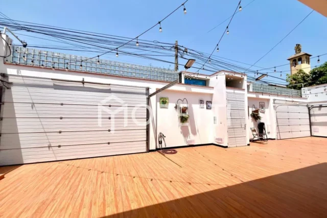 Cochera de 200 m² con capacidad para seis autos y dos puertas corredizas automáticas.